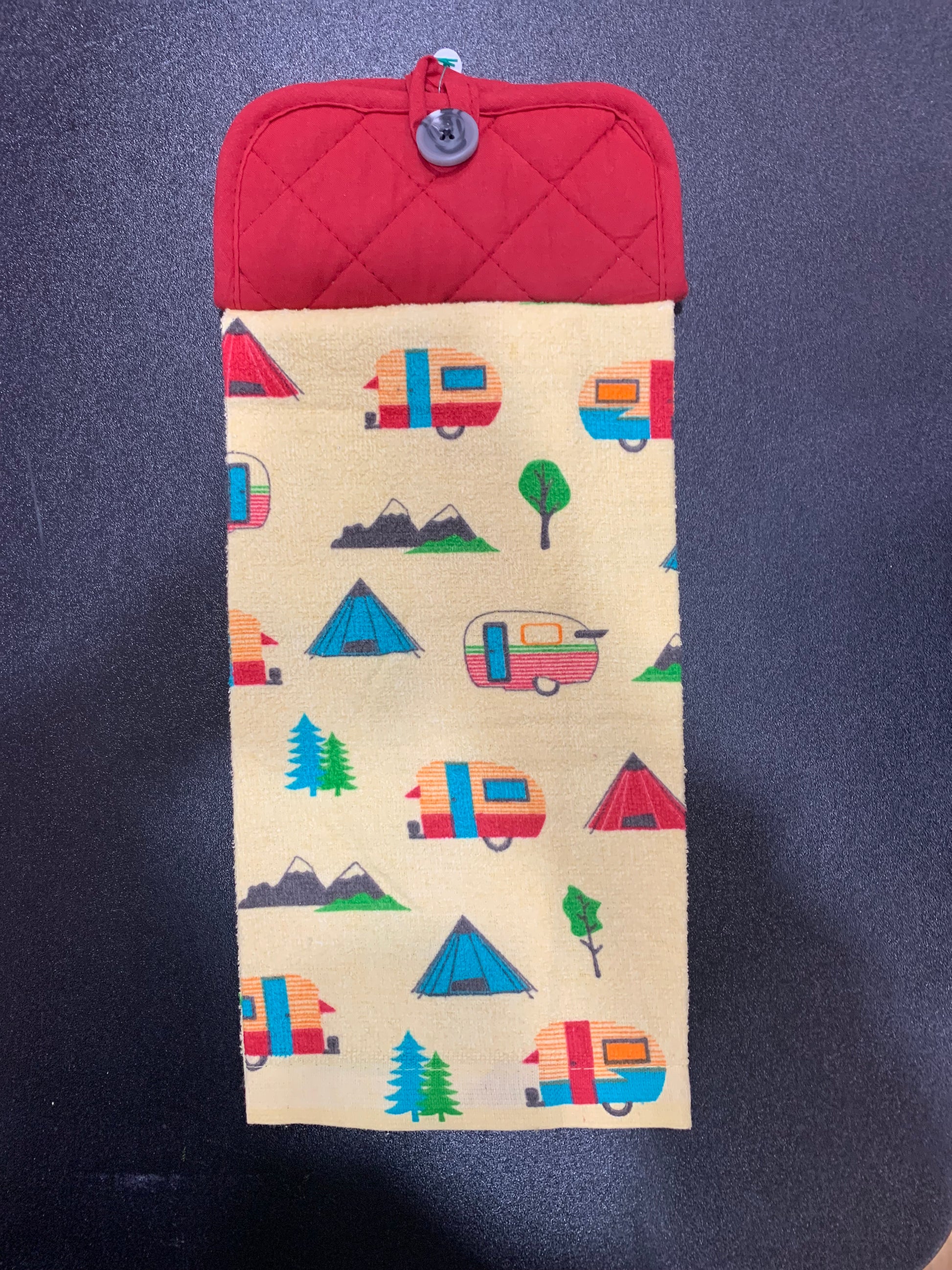 Camping Collection Handmade Hanging Dish Towel. Hangs on oven door, dishwasher, cabinet hook, etc... Makes a great affordable gift for anyone. 100% of the funds from your purchase goes to Addi to support her passion for dance. $6 each or buy any 2 hanging dish towels for $10