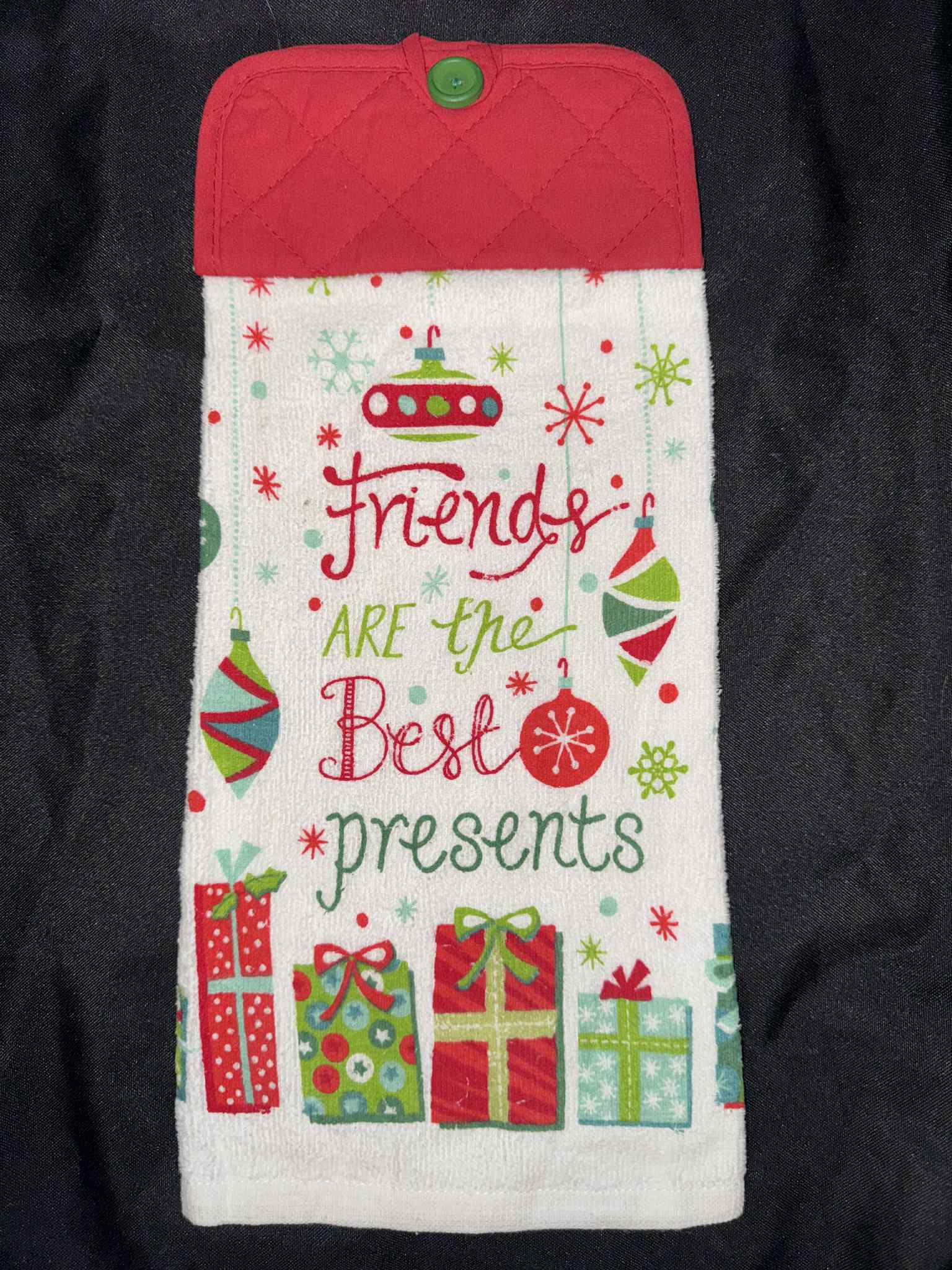 Christmas Collection Handmade Hanging Dish Towel. Hangs on oven door, dishwasher, cabinet hook, etc... Makes a great affordable gift for anyone. 100% of the funds from your purchase goes to Addi to support her passion for dance. $6 each or buy any 2 hanging dish towels for $10