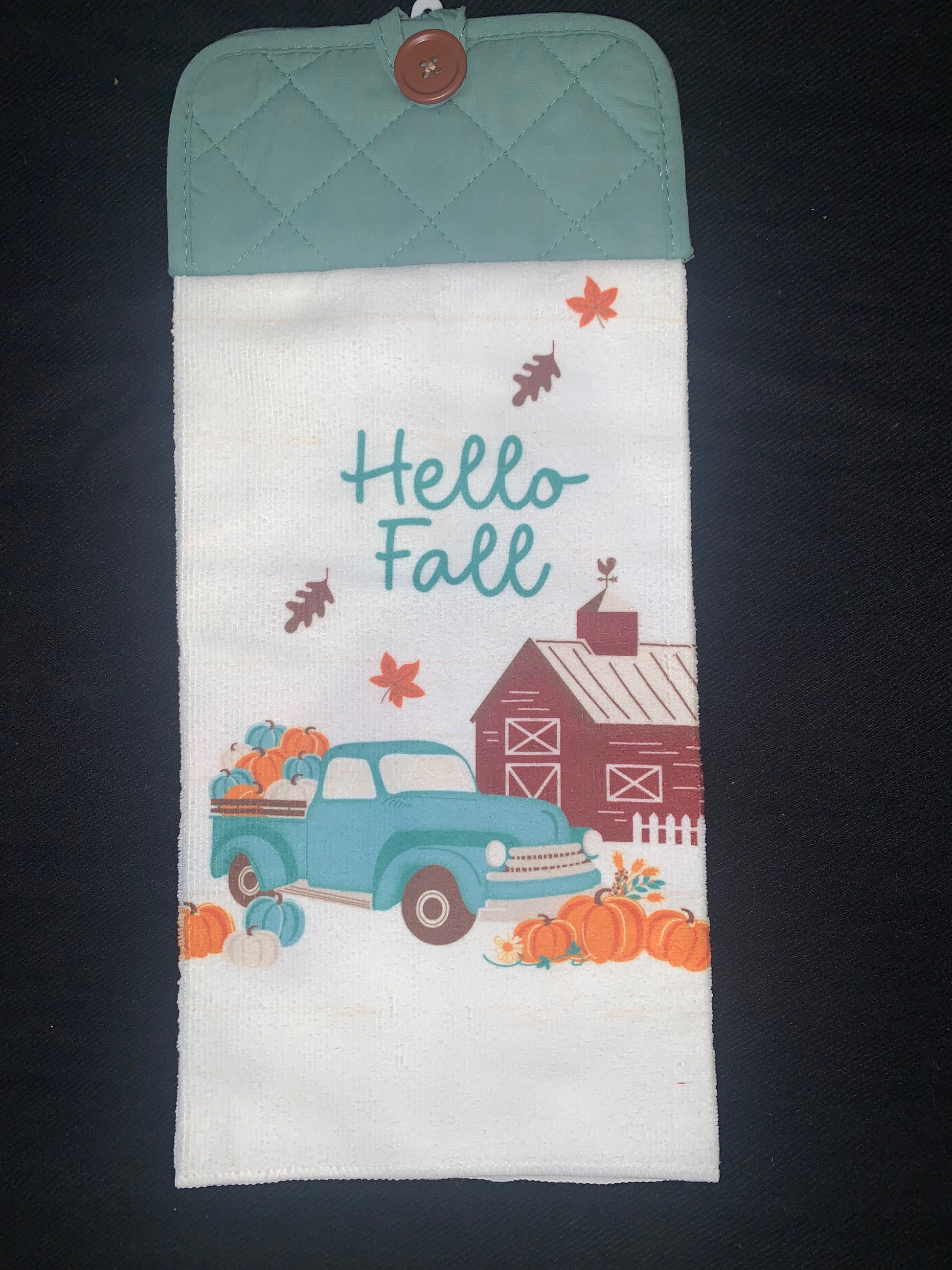 Fall Collection Handmade Hanging Dish Towel. Hangs on oven door, dishwasher, cabinet hook, etc... Makes a great affordable gift for anyone. 100% of the funds from your purchase goes to Addi to support her passion for dance. $6 each or buy any 2 hanging dish towels for $10