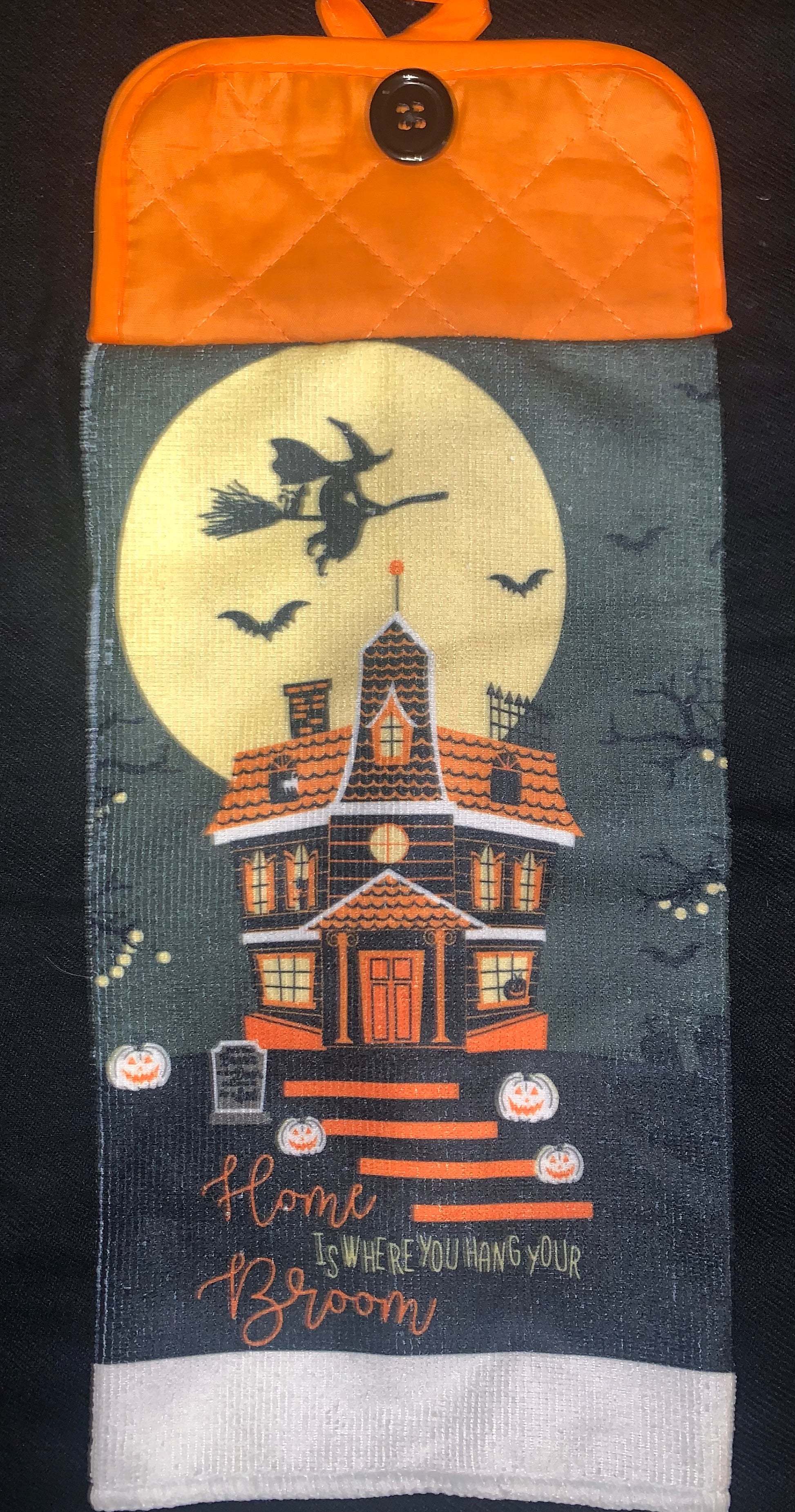 Halloween Collection Handmade Hanging Dish Towel. Hangs on oven door, dishwasher, cabinet hook, etc... Makes a great affordable gift for anyone. 100% of the funds from your purchase goes to Addi to support her passion for dance. $6 each or buy any 2 hanging dish towels for $10